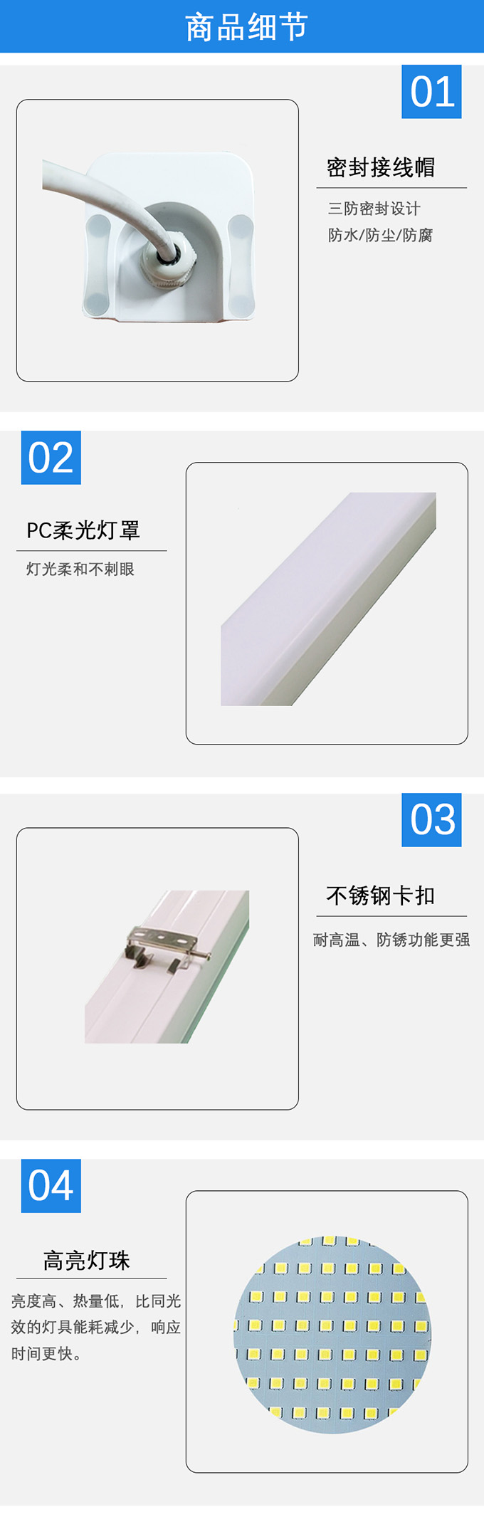 • 產(chǎn)品簡(jiǎn)介:1.密封接線(xiàn)帽,三防密封設(shè)計(jì) 防水/防塵/防腐 。 2.PC柔光燈罩 ,燈光柔和不刺眼 。 3.不銹鋼卡扣,耐高溫、防銹功能更強(qiáng) 。
